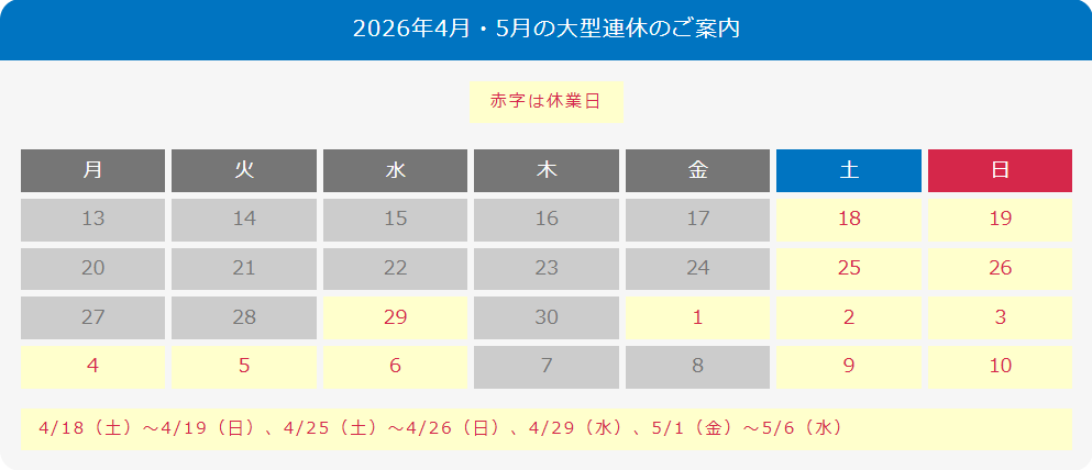 2026年4月29日(水)、5月1日(金)~5月6日(水) は、弊社長期休業日のため、お問い合わせ、ならびに2年保証サービスの購入証明確認については2026年4月30日(木)、および5月7日(木)より順次対応させていただきます。